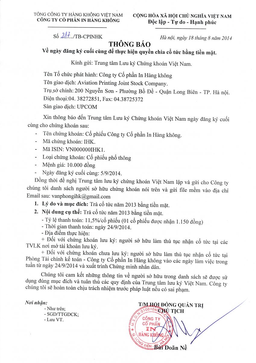 Thông báo chốt danh sách chi trả cổ tức 2013